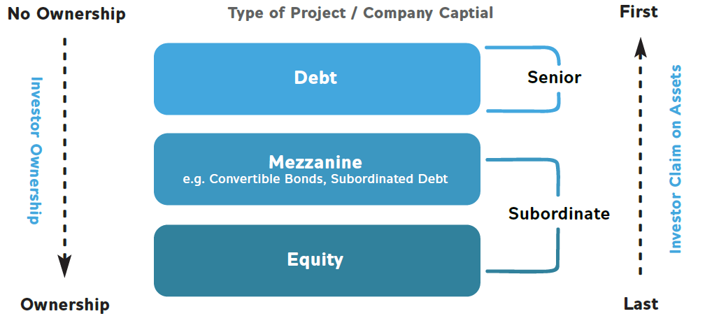 Mezzanine financing is a hybrid of debt and equity, and provides the lender the right to convert their loan, sometimes at a cheaper rate, into an equity stake in a company at the closing of a new round of funding or in case of default. Mezzanine is subordinate to senior debt and senior to equity—this means that mezzanine providers, in case of a company’s default, receive their money after regular debt providers and before equity owners.